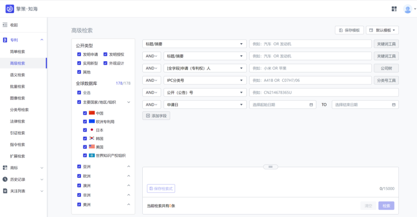 (二)产品功能:擎策·知海全球专利数据库配套简单检索、高级检索、语义检索、图像检索等十大专利检索工具和商标检索工具。