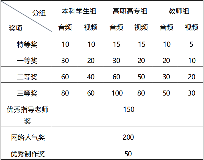 特、一、二、三等奖:评委将从主题内容、语言表达、情感演绎、 形象气质等方面对决赛作品进行综合评分。
