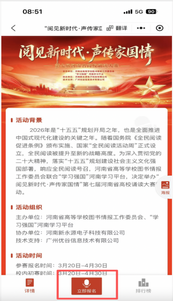 2026 年是“ 十五五 ”规划开局之年 ,也是全面推进中国式现代 化建设的关键之年。随着国务院《全民阅读促进条例》颁布实施、 国 家“ 全民阅读活动周 ” 正式设立 ,全民阅读被提升至新的战略高度。 为深入贯彻党的二十大精神 ,落实“ 十五五 ”规划建设社会主义文化 强国部署,响应全民阅读号召,河南省高等学校图书情报工作委员会 联合“ 学习强国 ”河南学习平台 ,决定举办“ 阅见新时代 · 声传家国 情 ” 第七届河南省高校诵读大赛活动。