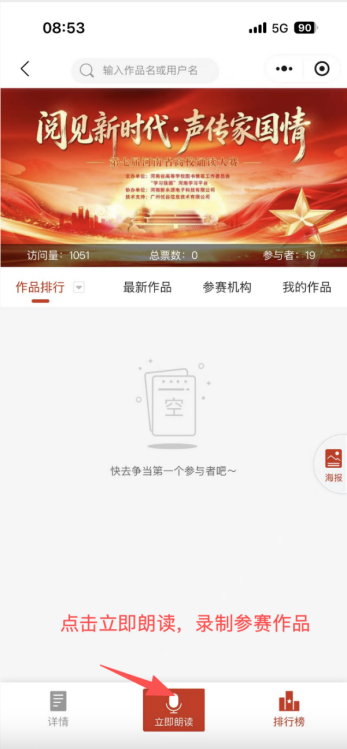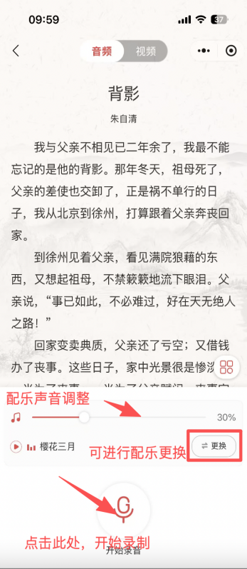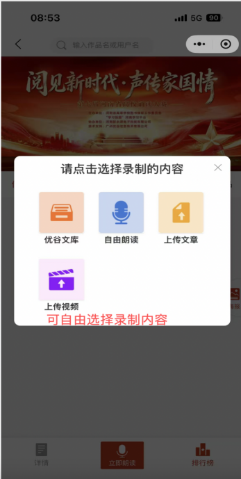 3. 报名信息填写后,即可进入作品录制及提交,参赛选手可围绕“阅见新时代·声传家国情”主题,选择合适的素材进行诵读(可参考“学习强国”“优谷文库”等资源库),搭配配乐进行创作(录制前在右下角“更换”选择自己喜欢的配乐);